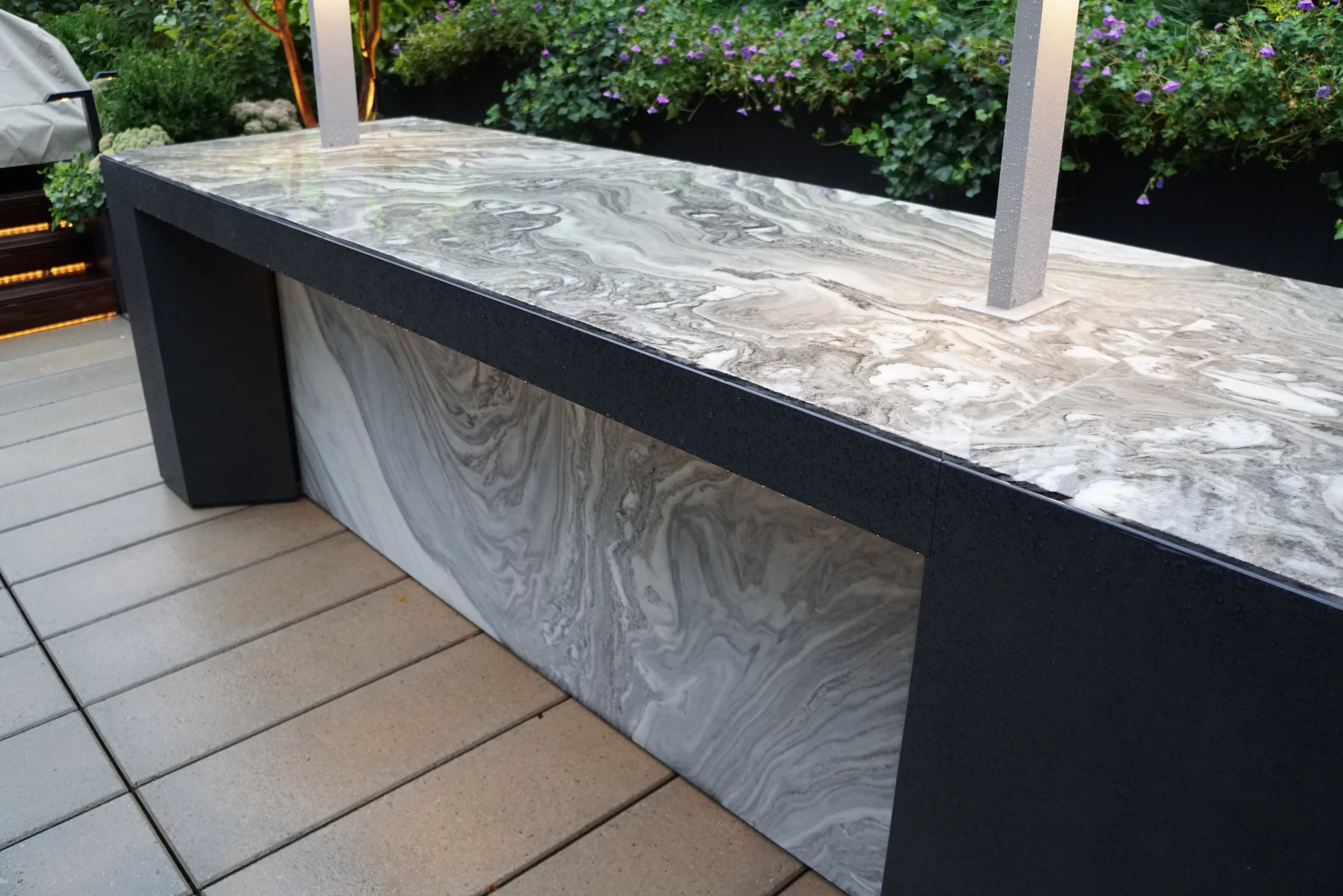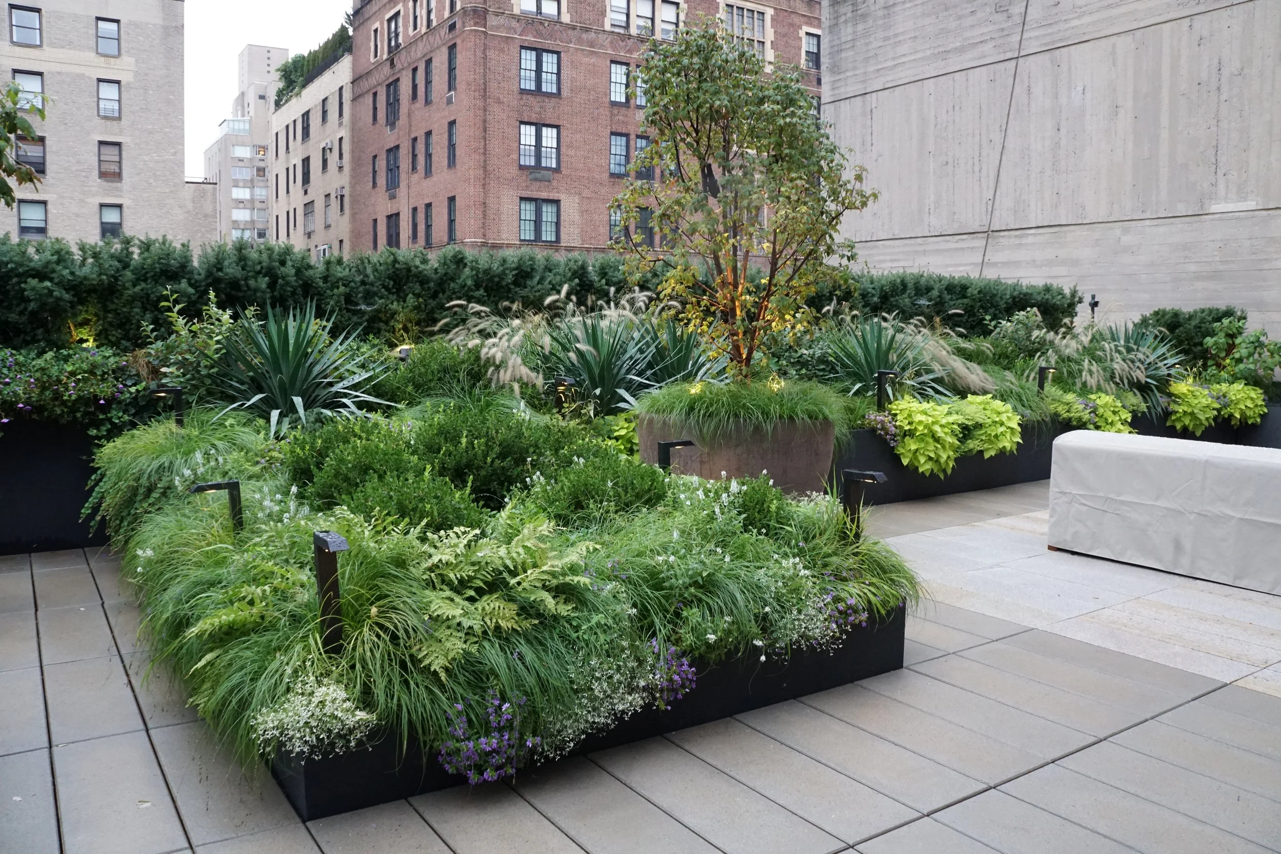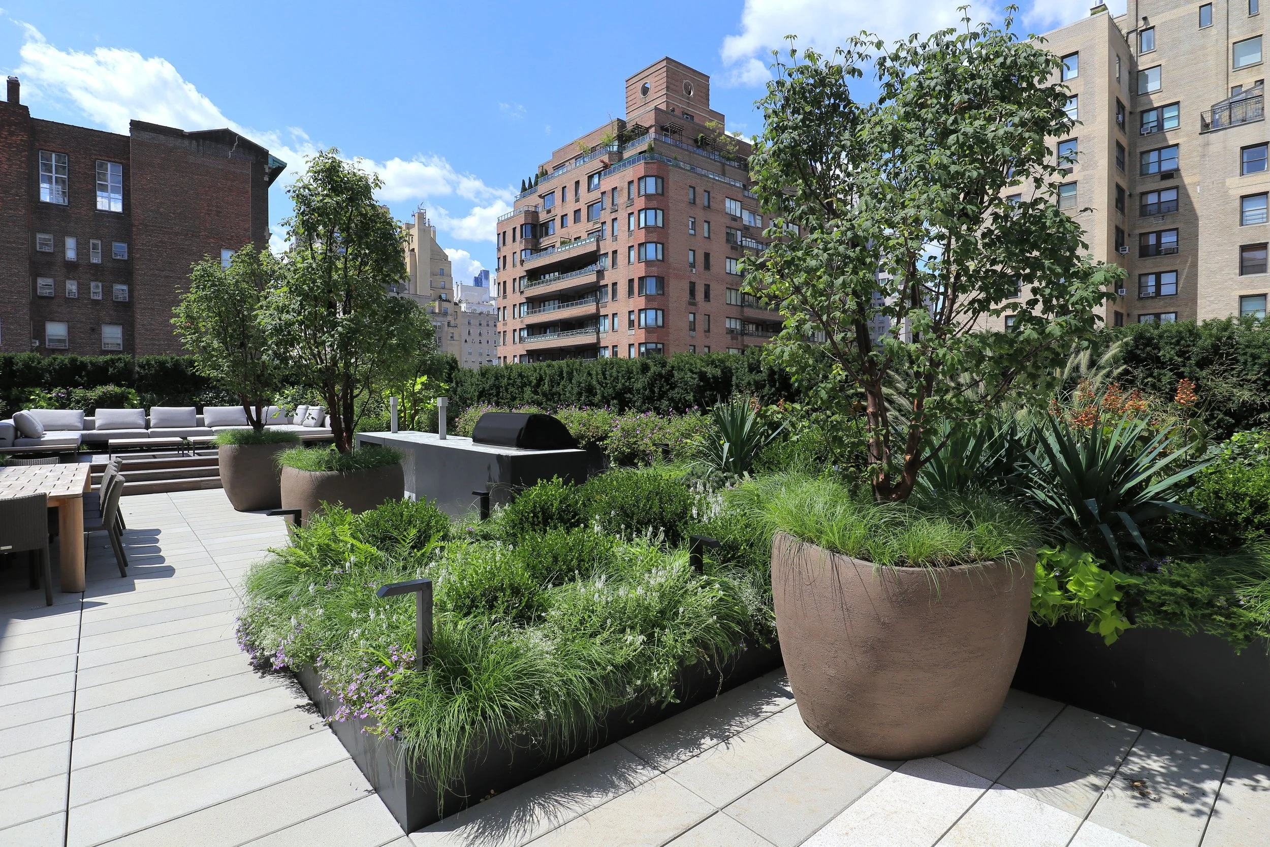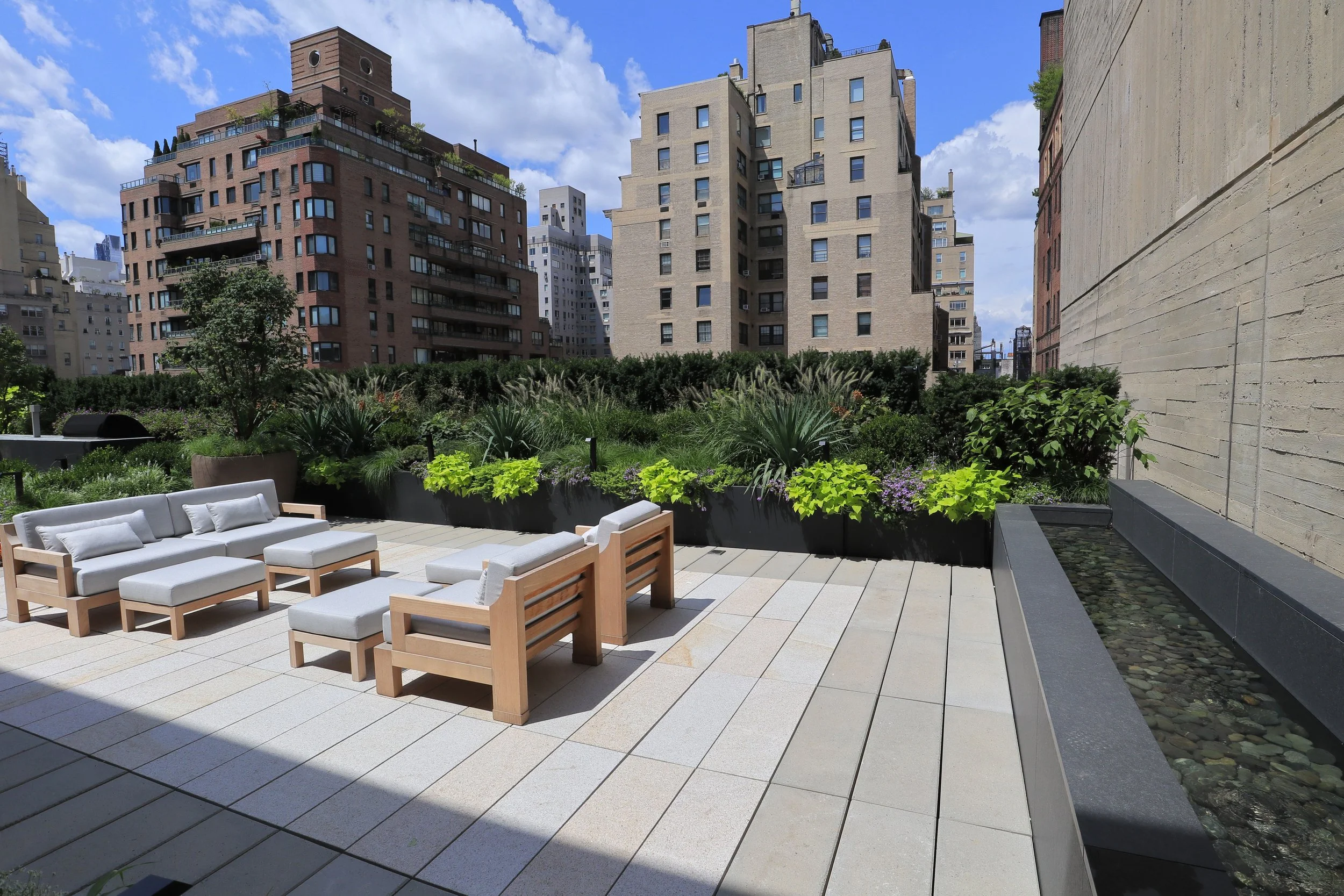 A NYC terrace is transformed into an outdoor living room bursting with botanical inspiration. Features include a custom waterfall Danby Marble bar and water feature wall.