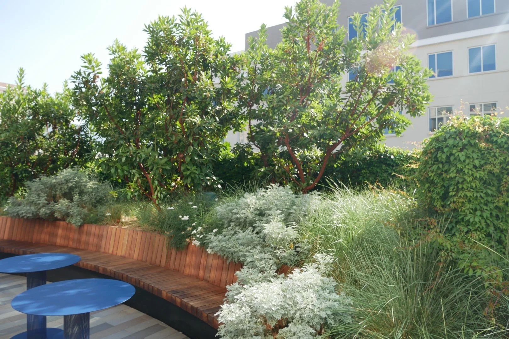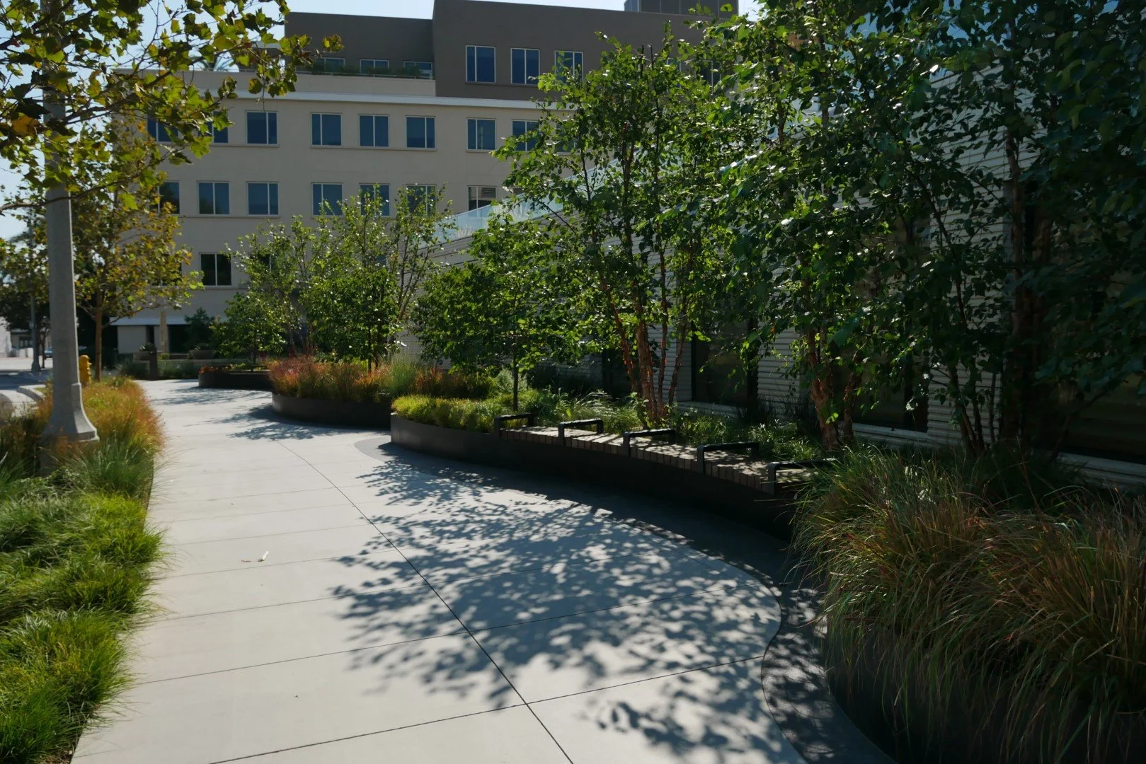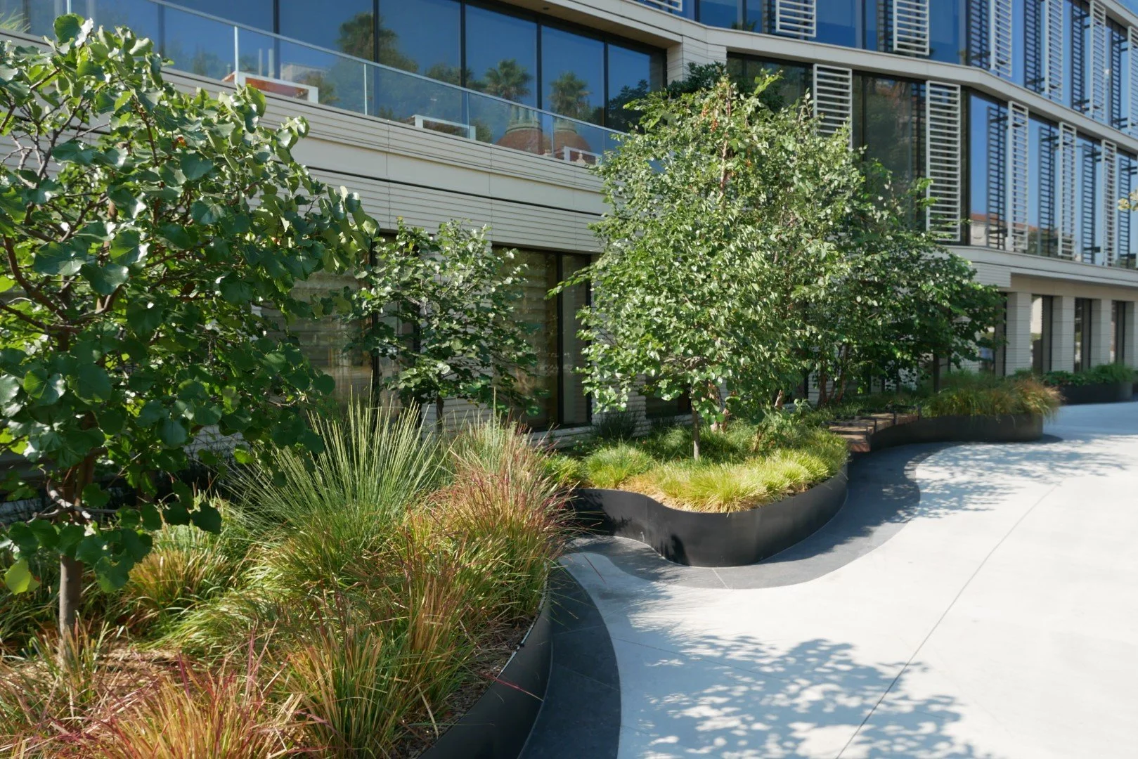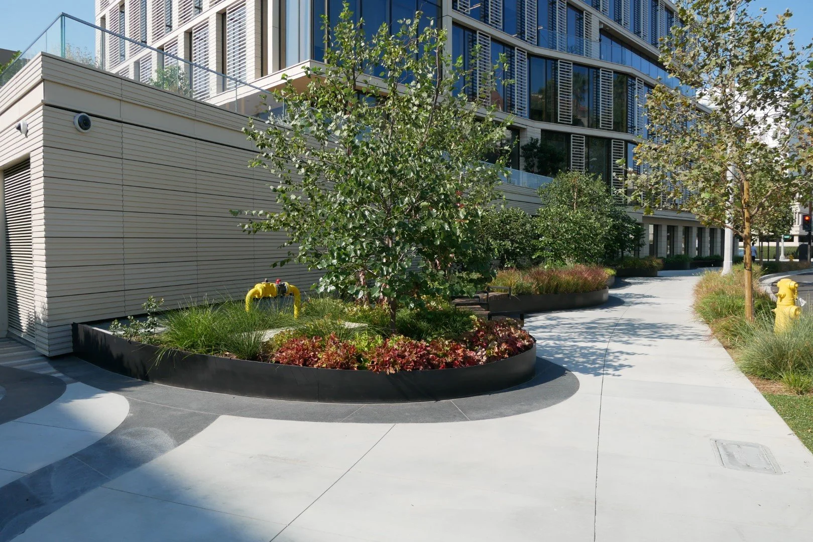 Drawing inspiration from meandering arroyos, the Alexandria Real Estate corporate headquarters landscape flows and weaves with Gensler’s architectural forms. Attention is paid to creating a welcoming streetscape and paseo gathering spaces to integrate the project into the unique Pasadena Civic Center urban fabric. West coast-sourced granite paving weaves from the public to the private realm, contouring the custom metal planters and benches. Upper-floor employee gathering spaces host pollinator and edible gardens for stimulating respite and delight.