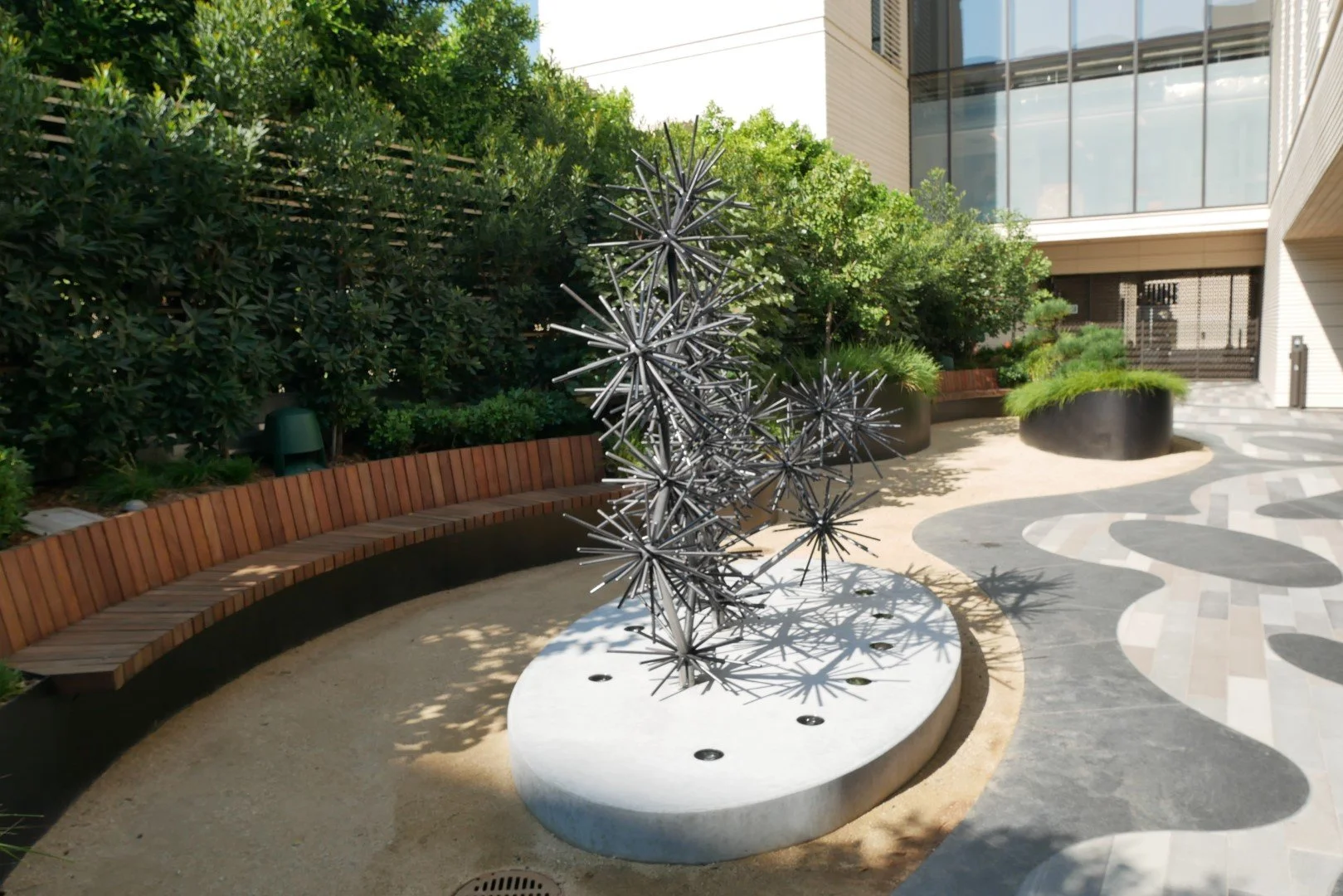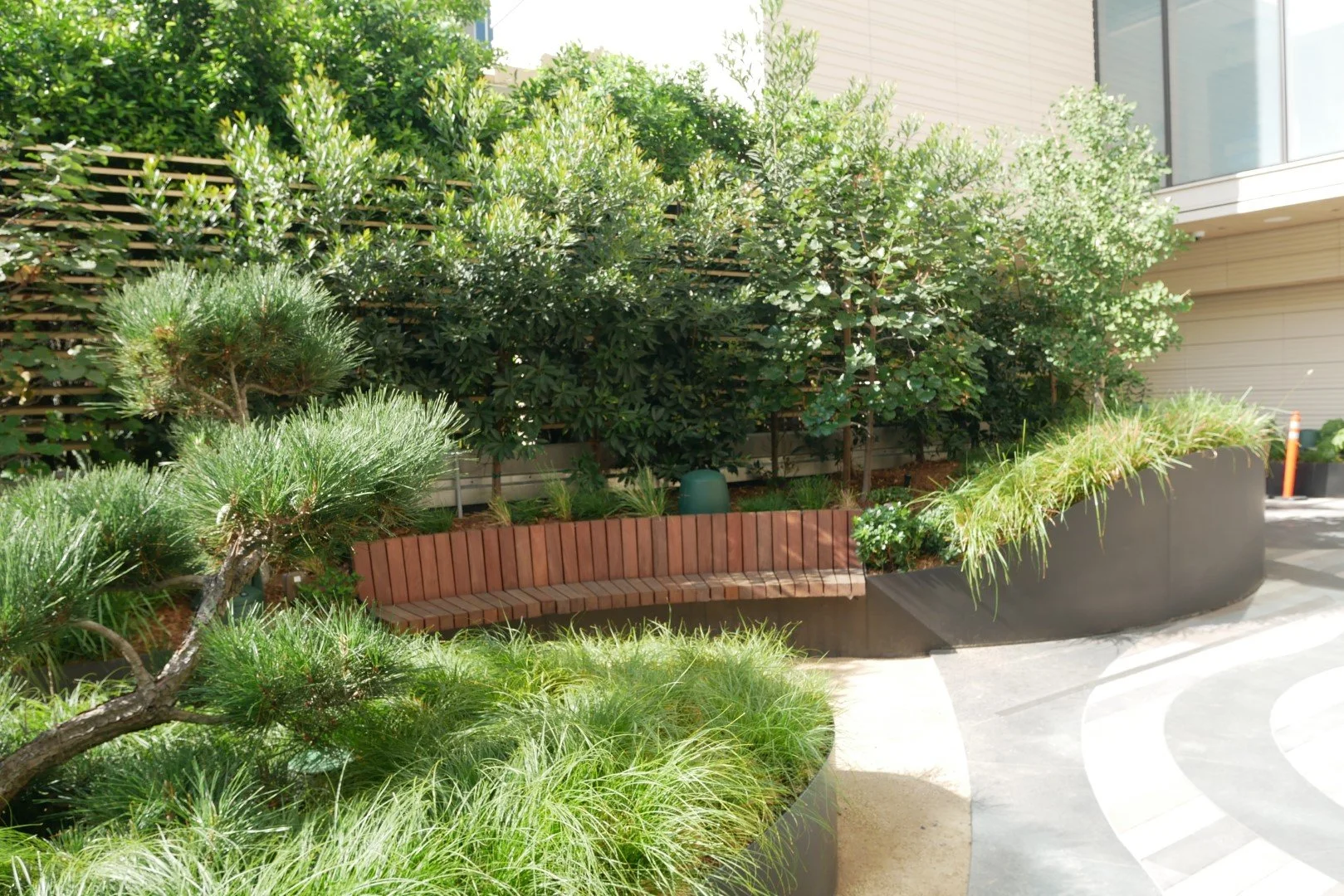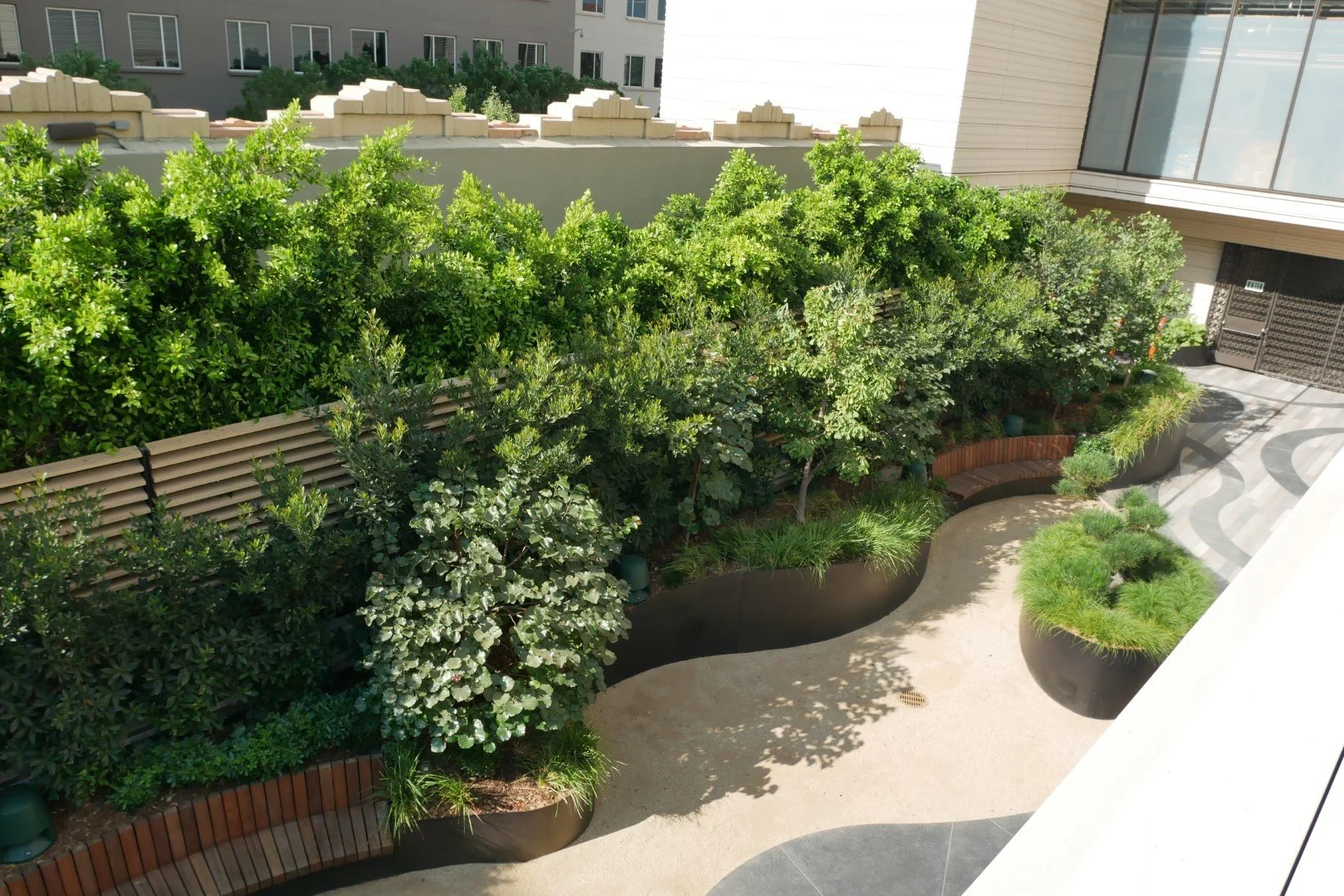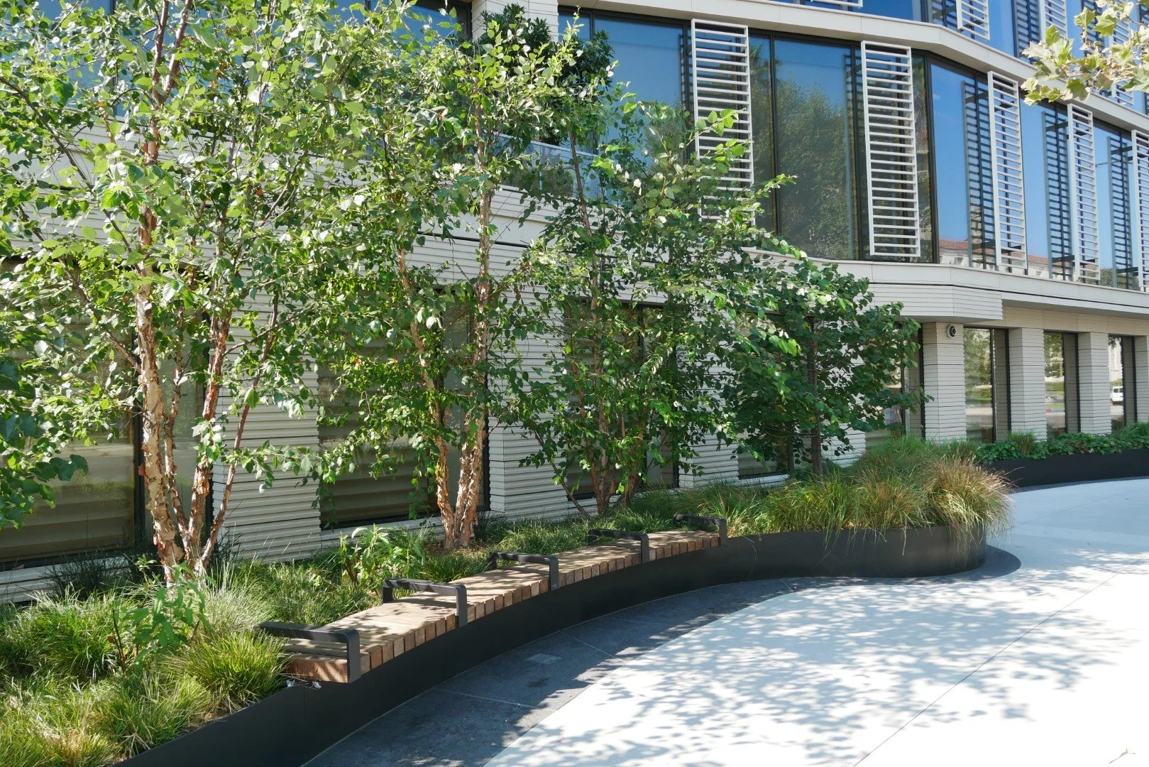 Drawing inspiration from meandering arroyos, the Alexandria Real Estate corporate headquarters landscape flows and weaves with Gensler’s architectural forms. Attention is paid to creating a welcoming streetscape and paseo gathering spaces to integrate the project into the unique Pasadena Civic Center urban fabric. West coast-sourced granite paving weaves from the public to the private realm, contouring the custom metal planters and benches. Upper-floor employee gathering spaces host pollinator and edible gardens for stimulating respite and delight.