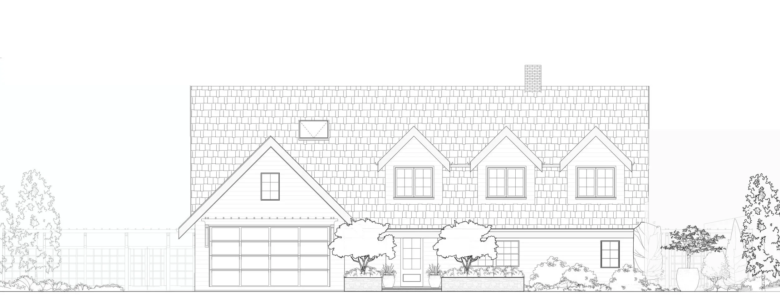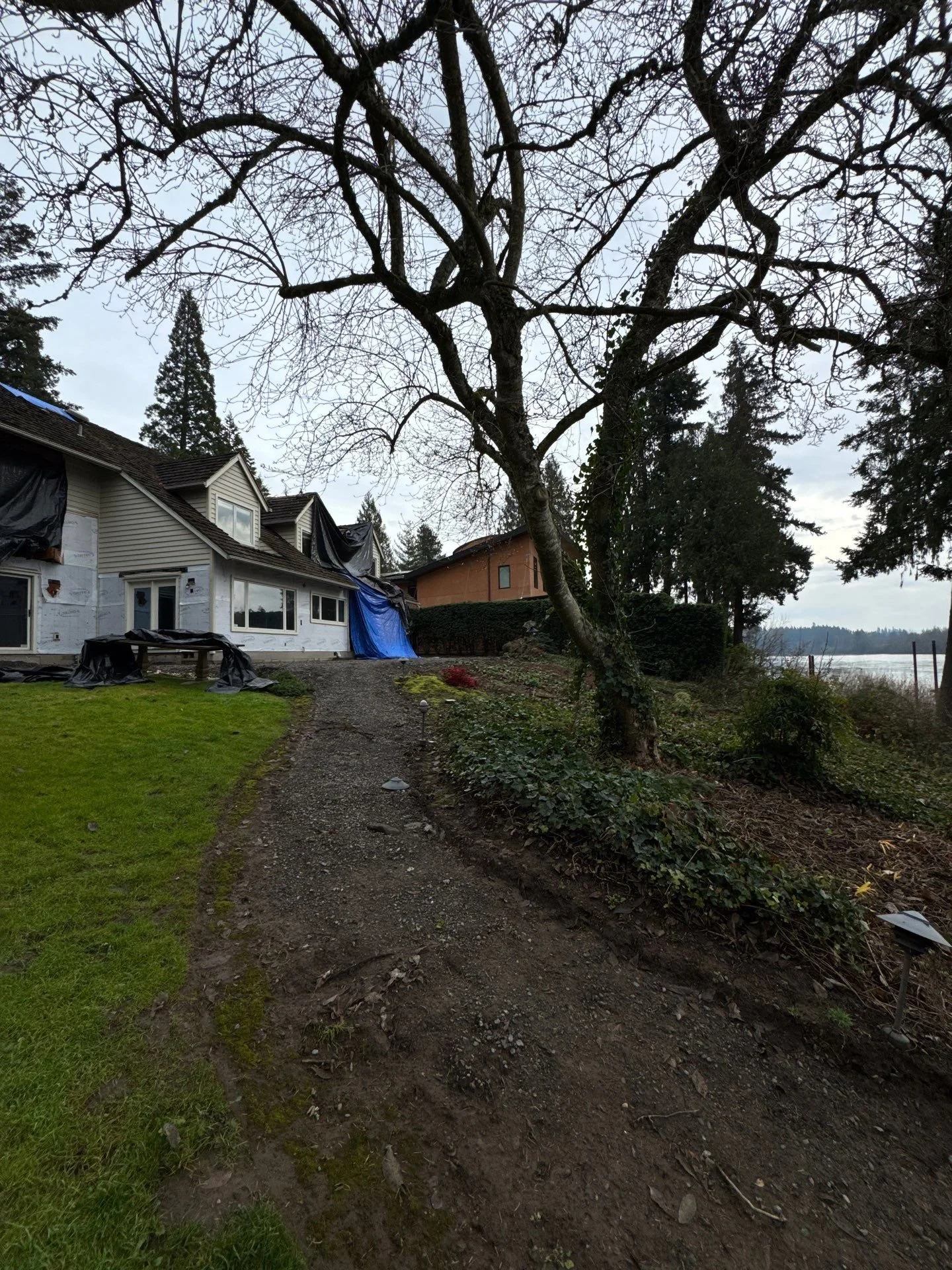 Scope includes full site improvements, including new hardscape, driveway, decks, renovated slope garden, fireplace, pergola/fences/gates, terraced formal gardens, meadow, drainage, irrigation and planting.