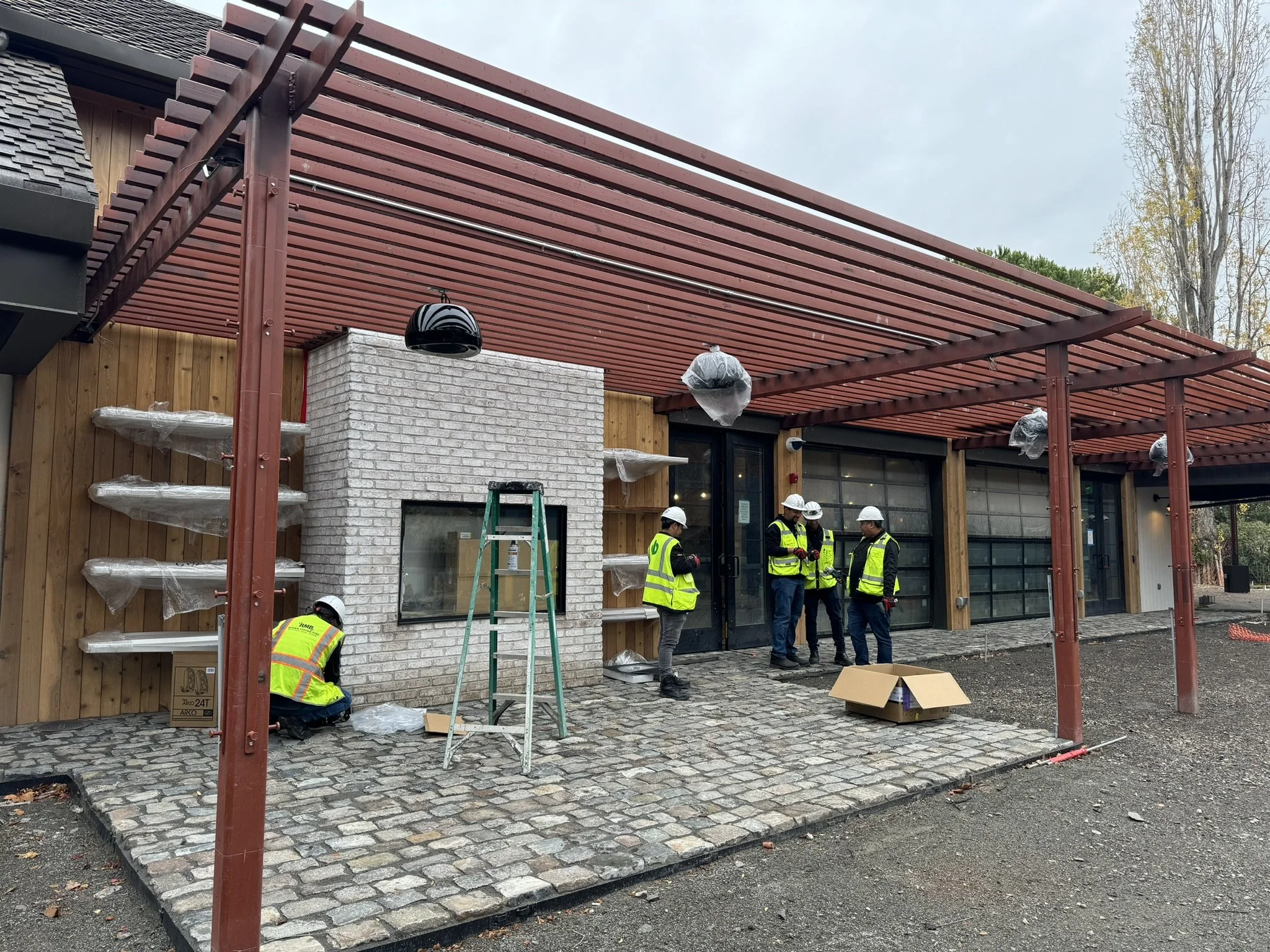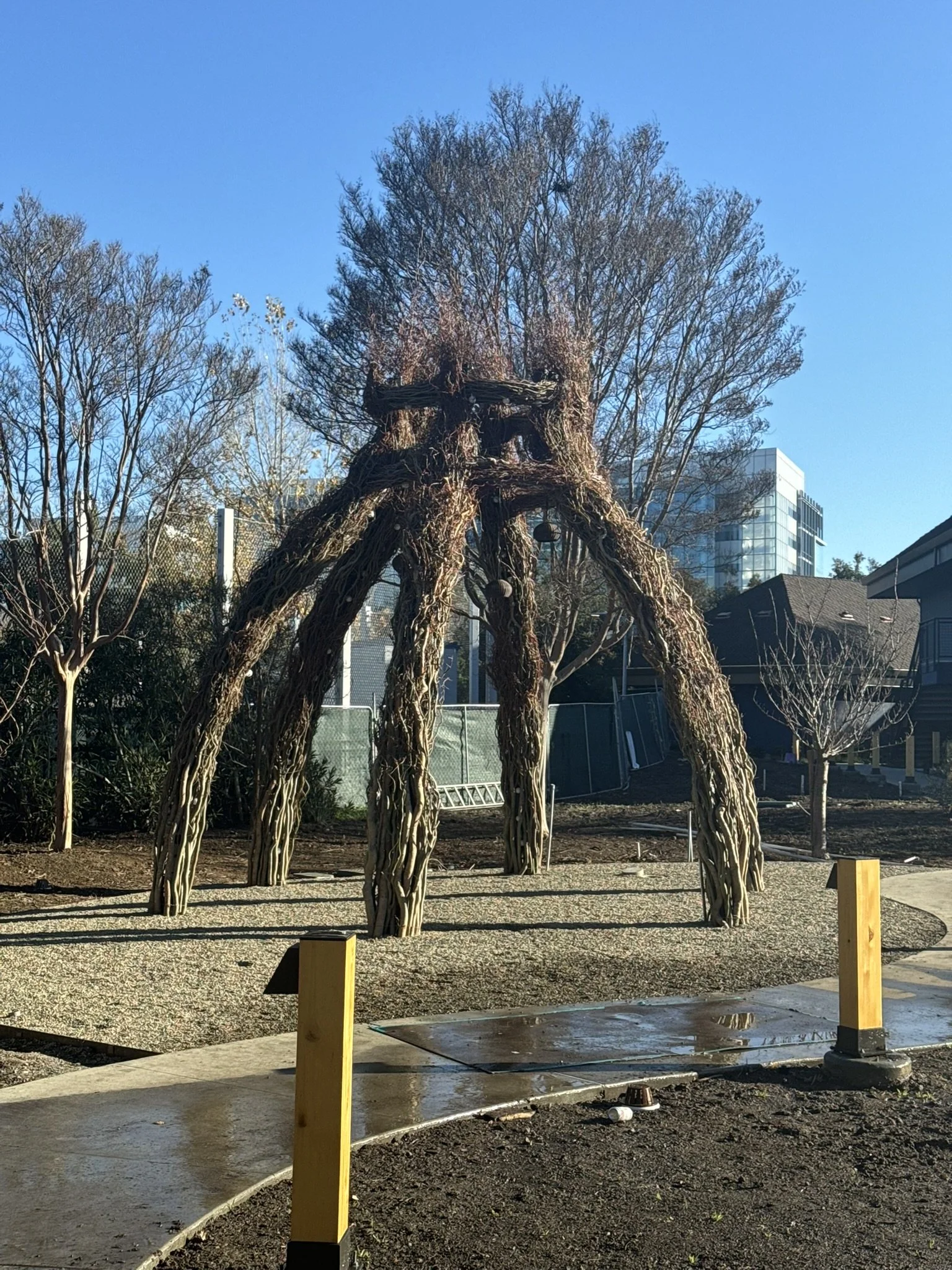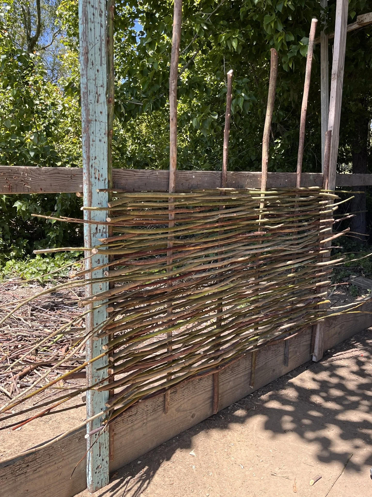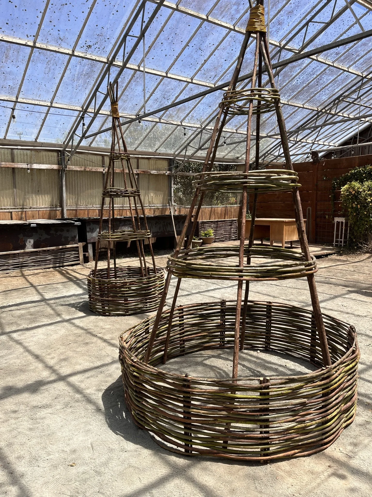Just beyond the meadow, a 100-year-old Sevillano olive anchors a collection of willow-woven outdoor vegetable beds. Willow Farm, a local willow grower and weaver, fabricated these elements. Willow Farm’s craft extends to the woven arbor, flanked by Kwanzan cherry trees and delightful woven and vine-covered trellises.
